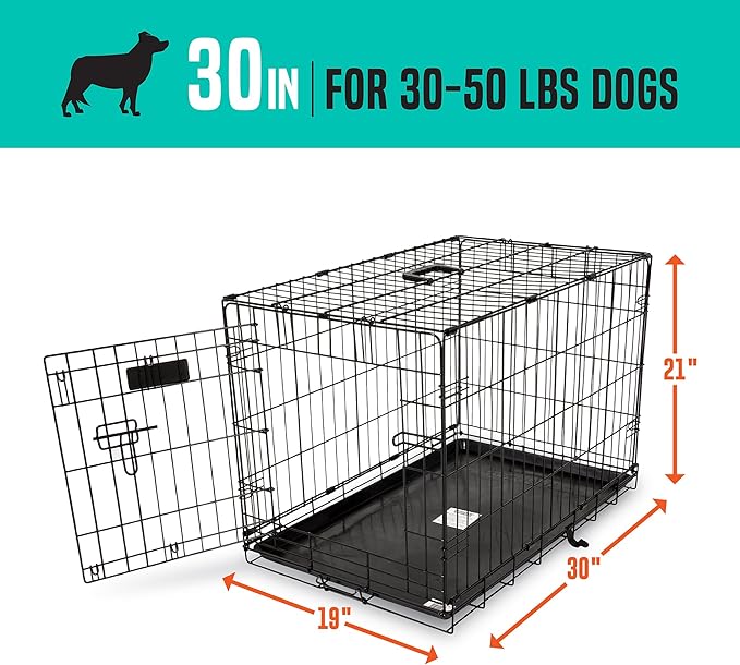 - 30 Inch Dog Crate: Measures 30" x 19" x 21" & weighs 19 lbs. Rounded corners eliminate sharp edges prevent snags and non-skid rubber feet protect floors. If in doubt, buy a size up. This collapsable dog crate is easy to store & transport