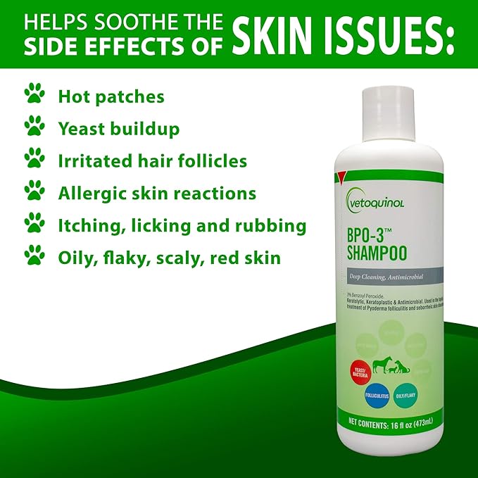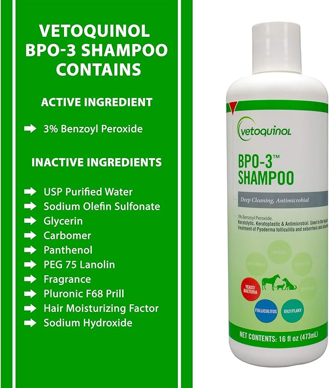 Vetoquinol BPO-3 Shampoo for Dogs, Cats & Horses (3% Benzoyl Peroxide) – 16oz – Deep Cleaning, Medicated Shampoo Opens & Flushes Hair Follicles – Degreases Oily Coats – Soothes Red, Flaky, Itchy Skin