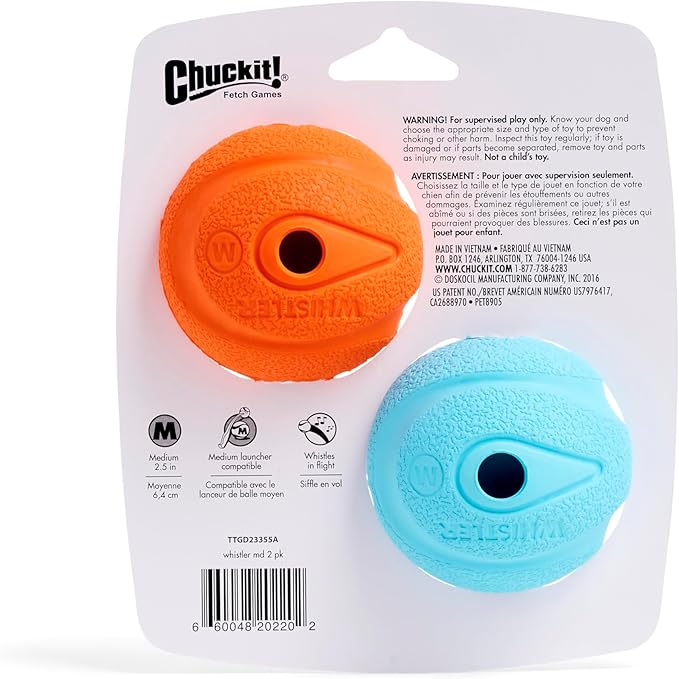 - Whistles When Launched: This 2.5" dog ball is designed with four sound holes that create a whistling sound, making fetch more exciting for dogs. Recommend using any size Medium Chuckit launcher; casually tossing The Whistler will not yield loud whistles