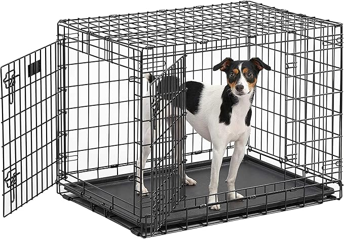 - Double door heavy-duty folding metal dog crate | Includes free divider panel, leak-proof plastic pan, a strong carrying handle, rubber feet to protect floors