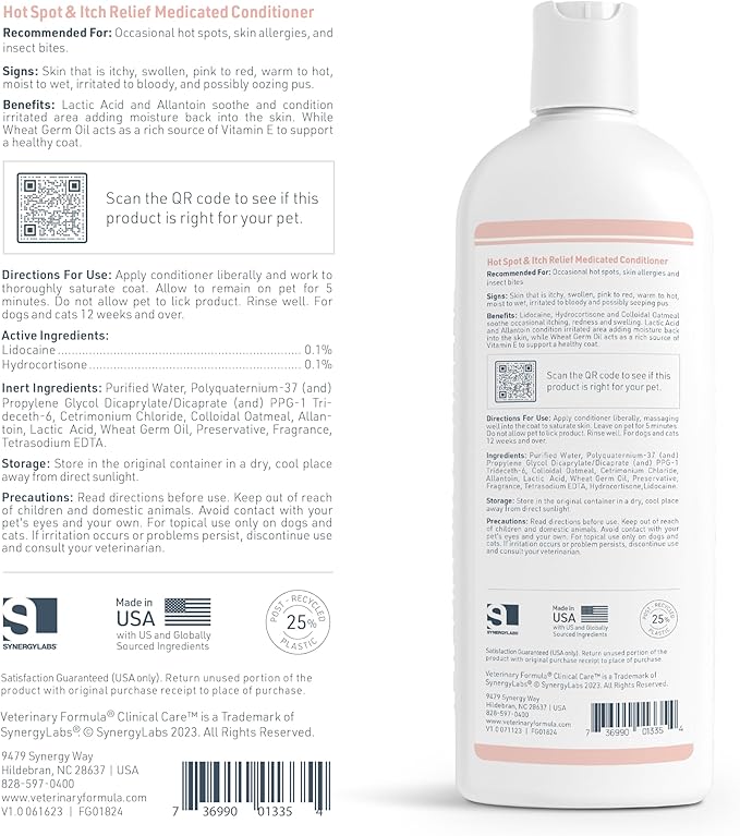 Veterinary Formula Clinical Care Hot Spot & Itch Relief Cat & Dog Medicated Conditioner, 16 oz – Oatmeal Conditions Skin for a Lustrous Coat, Formulated to Help Alleviate Itchy Skin