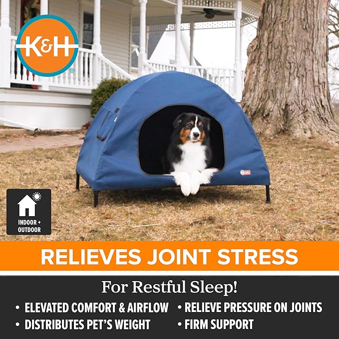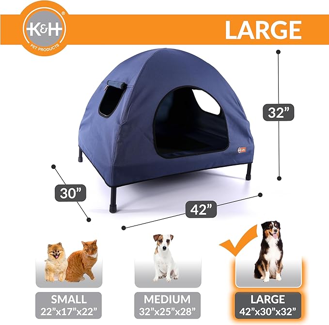K&H Pet Products Pet Cot House for Large Dogs, Outdoor Elevated Dog Cot House, Enclosed Canopy, Window Flaps for Air Flow, Washable Cover, Raised Metal Frame, Collapsible - Large 42 X 30in Blue