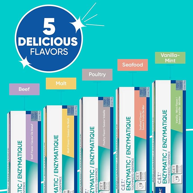 • CET toothpaste formulated for dogs and cats to provide natural antibacterial action and to inhibit the formation of plaque.