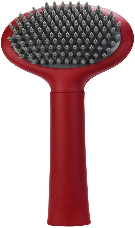 - Dog grooming brush made with gray rubber bristles, gray pad and red handle