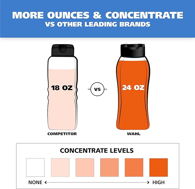 - Less is More - Wahl has a higher concentrate of coconut derived sodding agent, which means you don’t have to use as much as other dog shampoos. A little bit of shampoo goes a long way and provides a rich lather that’s easy to rinse off