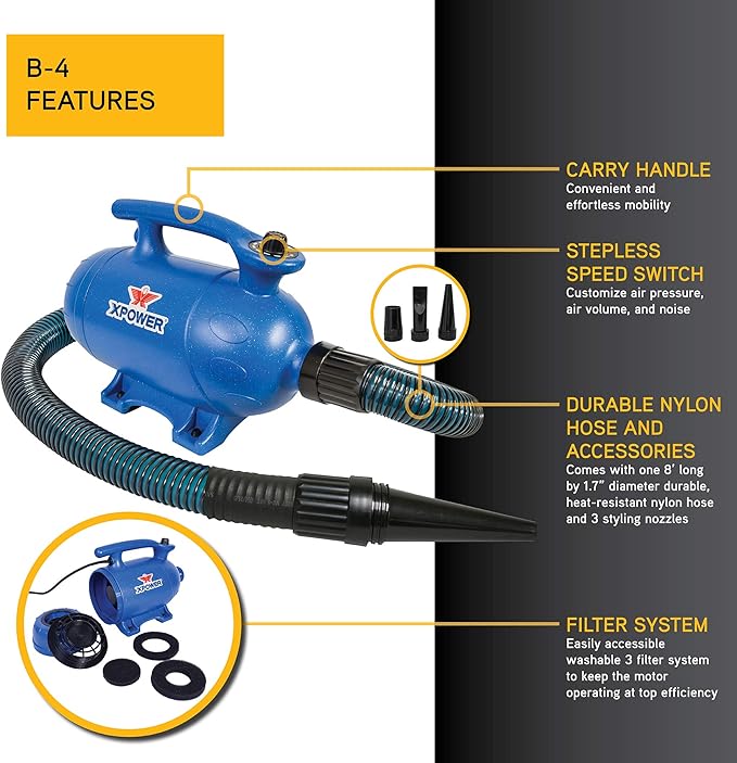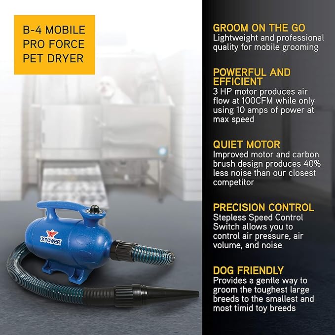 XPOWER B-4 Professional Pet Grooming Force Dryer with Powerful and Quiet Motor, Variable Speed Control, Versatile For All Coats and Breeds