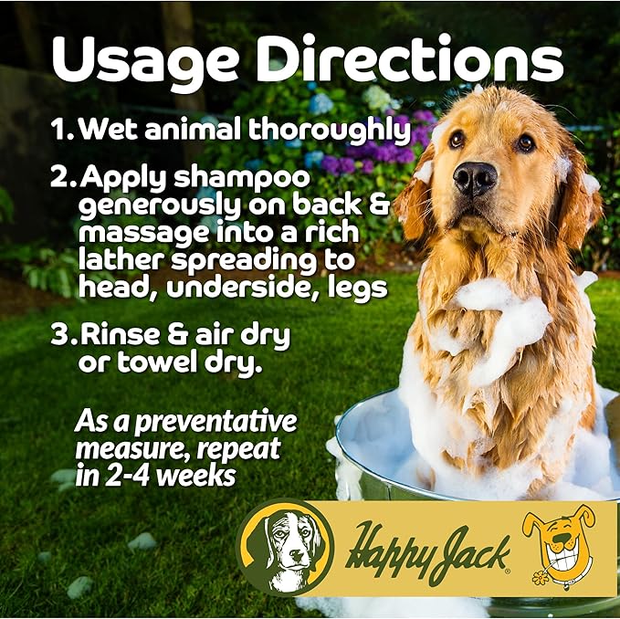 - APPLICATION. Wet dog and apply a generous amount of shampoo into the skin and massage in. Rinse and dry. Repeat every 2-4 weeks if symptoms occur.
