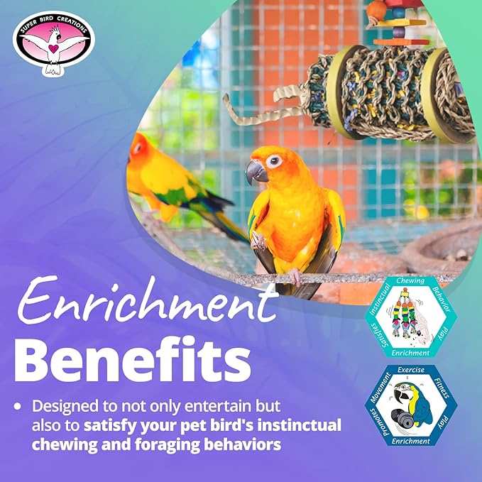 Super Bird Creations SB687 Firecracker Jr. Bird Toy - Foraging Chewing Swinging Toy for Parrots, Conures, Quakers, Pionus, Senegals - Natural Paper Shred Palm Leaves - Medium Birds, Size: 18" x 8"