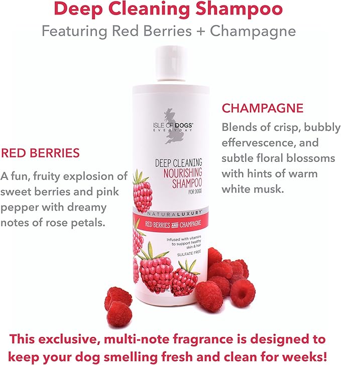- ODOR NEUTRALIZING: This gentle & deep cleaning dog shampoo features our signature red berries and champagne fragrance and contains natural odor neutralizers to leave your pup smelling clean & fresh