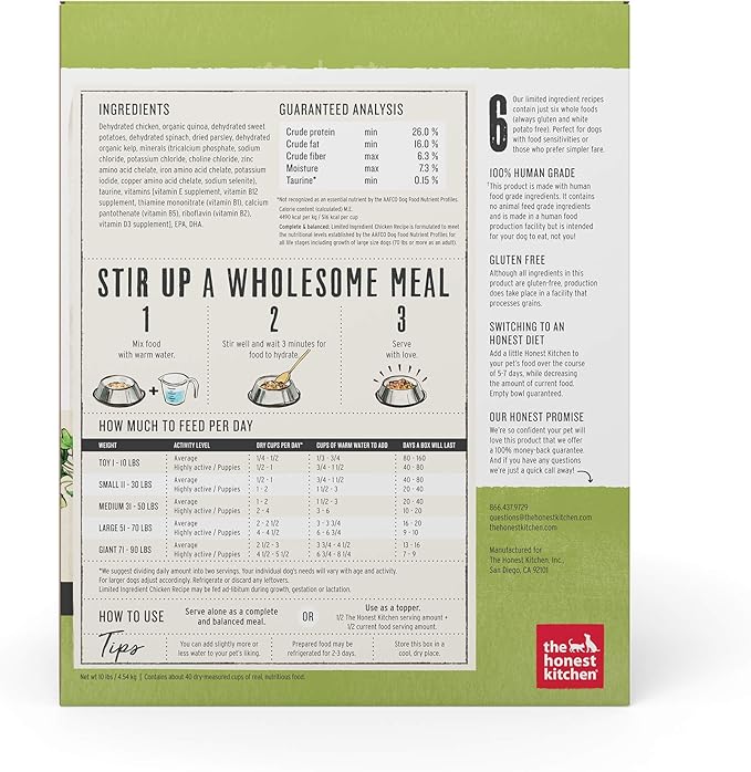- LIMITED INGREDIENT, CAGE FREE CHICKEN: With just six whole food ingredients, The Honest Kitchen Limited Ingredient Chicken dog food is made especially for dogs with food sensitivities or allergies.