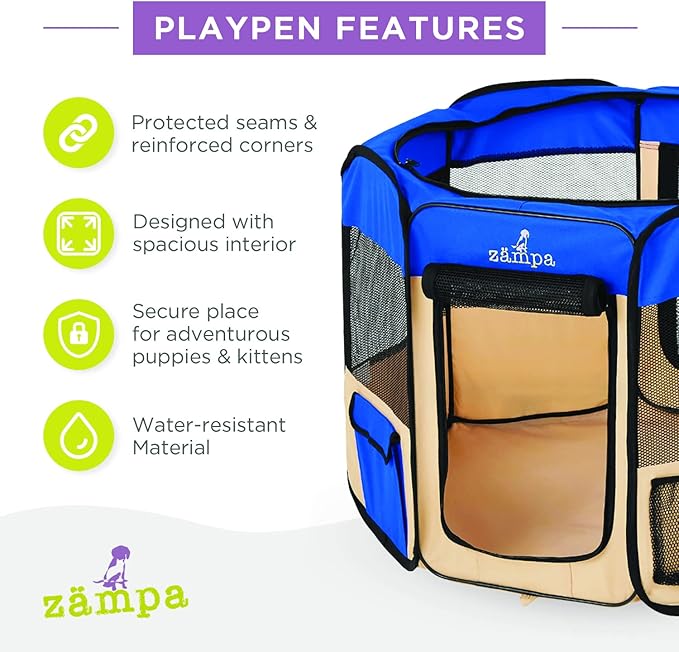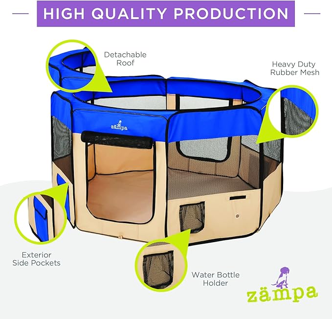 - What To Expect From Zampa: Playpen, mesh top to zip on when needed, 4 metal spikes for outdoor safety, carrying case, and a commitment from our customer service team. Please don't hesitate to contact our customer service and BARK, we will make it right.