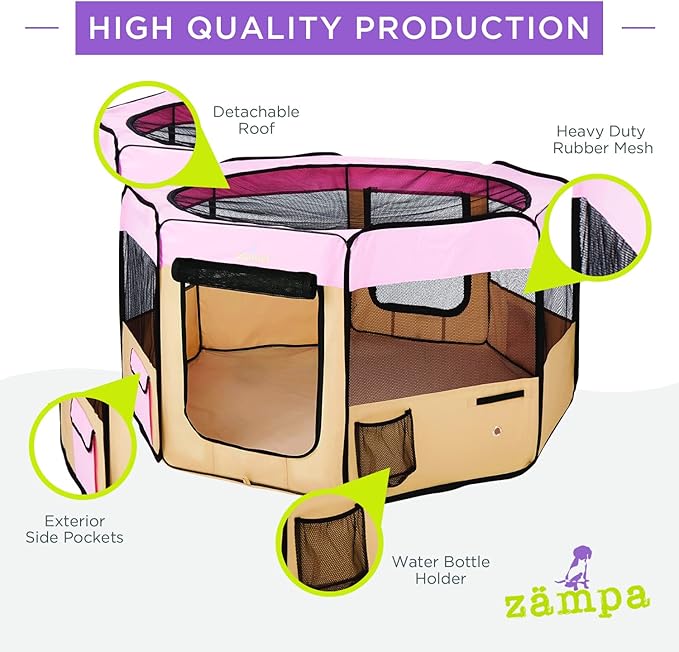 - What To Expect From Zampa: Playpen, mesh top to zip on when needed, 4 metal spikes for outdoor safety, carrying case, and a commitment from our customer service team. Please don't hesitate to contact our customer service and BARK, we will make it right.