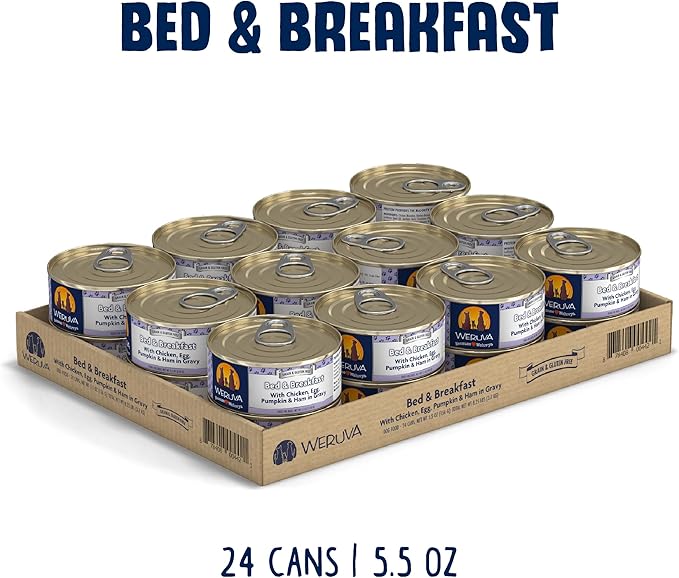 Weruva Classic Dog Food, Bed & Breakfast with Chicken, Egg, Pumpkin & Ham in Gravy, 5.5oz Can (Pack of 24), Blue