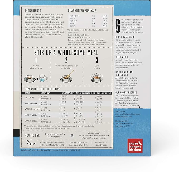 - LIMITED INGREDIENT & GRAIN FREE, CAGE FREE TURKEY: With just six whole food ingredients, The Honest Kitchen Limited Ingredient Turkey dog food is made especially for dogs with food sensitivities or allergies.