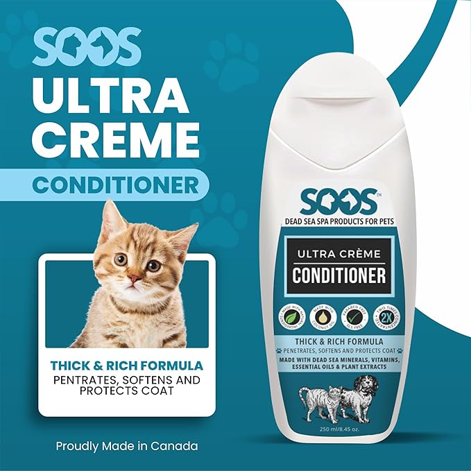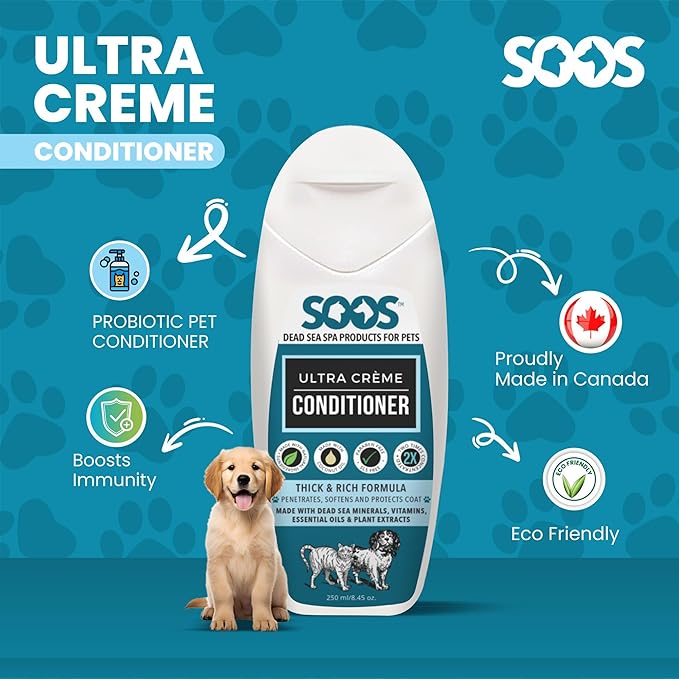 - PET'S CLEAN AND HEALTHY HAIR: Would you like to help your pet have a clean and healthy Skin and Coat? Soos (Ultra Crème) Conditioner helps to care and maintain the health of your pets’ skin and coat. This natural treatment uses its amazing formula to help boost your cat or dog's appearance and shine whilst helping to reduce dirt, redness, and irritation. This dog conditioner make hair smooth and shine