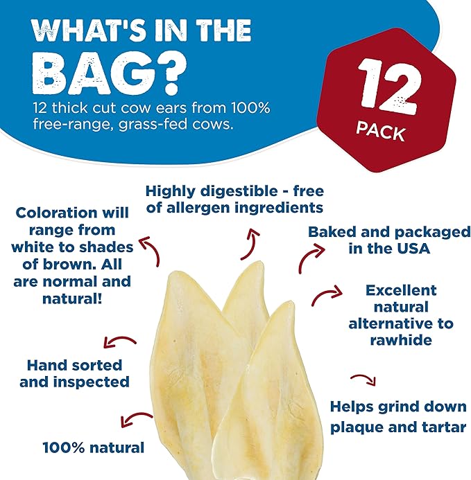 - HIGH IN PROTEIN: Cow ears for dogs are a nutritious source of protein and rich flavor. Each cow ear is sourced from grass-fed beef, and is a tasty treat for dogs who can benefit from a little extra protein in their diets.