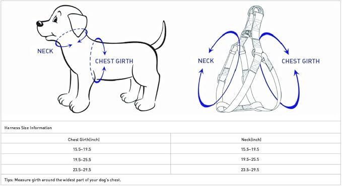- Chest Girth 15.5-19.5", Chest Strap 4.5", Width 5/8", XS/S; The chest strap is not adjustable. For a safe and fit purchase, be sure to check the neck and chest; A properly fitting collar and harness won't leave any room for your dog to chew.