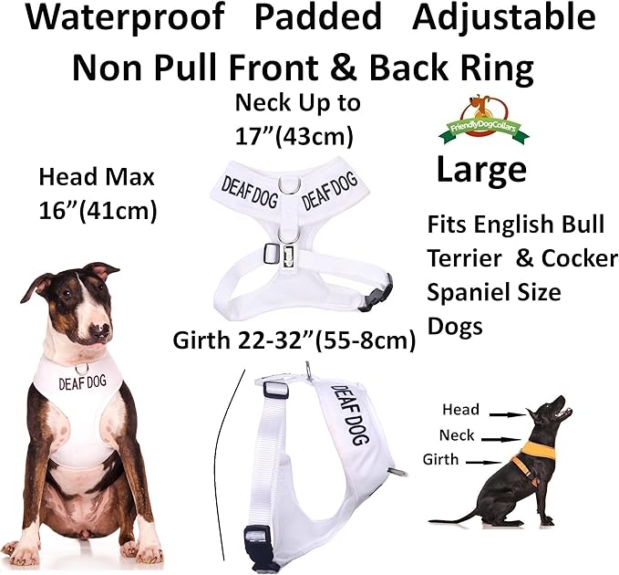 Deaf Dog (Dog Has Limited/No Hearing) White Colour Coded Non-Pull Front and Back D Ring Padded and Waterproof Vest Dog Harness Prevents Accidents by Warning Others of Your Dog in Advance (L)