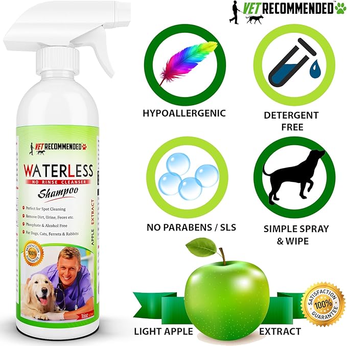 Waterless Dog Shampoo No Rinse Dry Shampoo for Dogs (16oz), Detergent and Alcohol Free, Apple Extract - Perfect for Spot Cleaning The Dog Coat - Made in USA