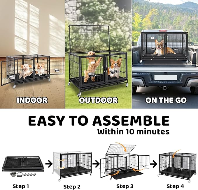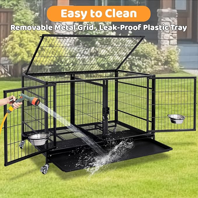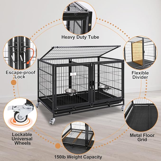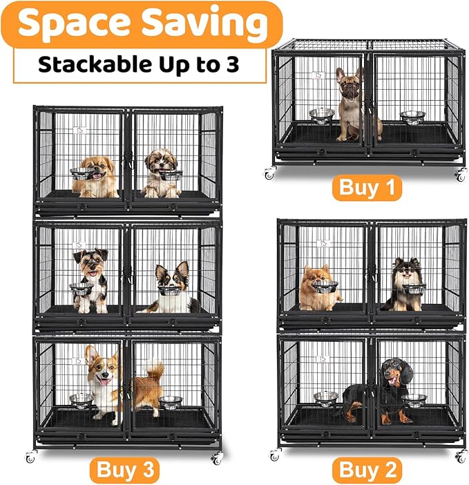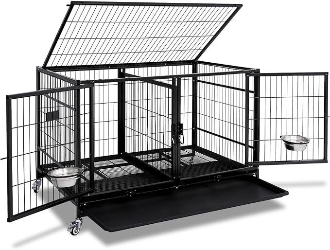 Homey Pet 43 Inch Metal Open Top Stackable Heavy Duty Dog Cage Kennel with Three Door, Metal Floor Grid, Tray, Wheels, Divider and Feeding Bowl, Drop Dog Cages Indoor