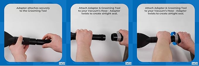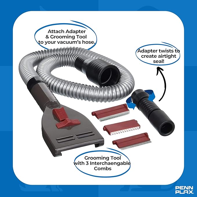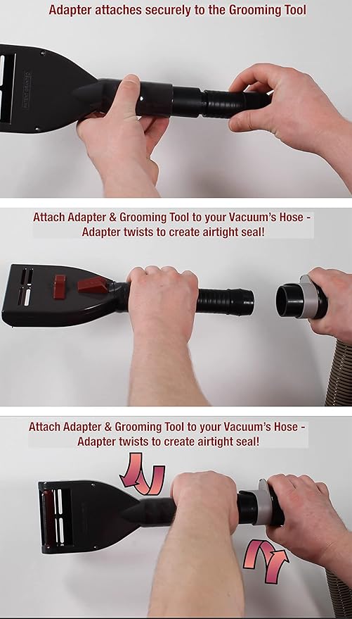 - IMPROVED VIDEO TO SHOW HOW TO ATTACH: The VacGroom Kit allows you to groom your dog or cat with the upmost ease. In this kit, you get the Grooming Tool, 3 Interchangeable Combs, and a 46” Extension Hose with Universal Adapter – check out the video on the left to see how to Insert and Twist to create a vacuum seal.