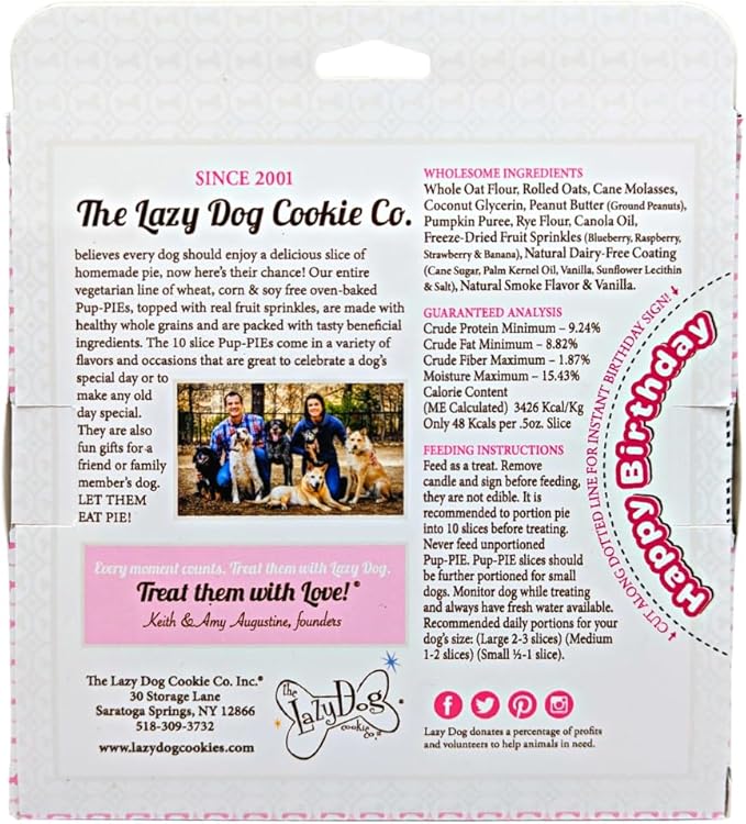 - CELEBRATE WHILE HELPING OTHERS - The manufacturer of Pup-PIE, The Lazy Dog Cookie Co. regularly donates a percentage of its profits to provide aid for animals in need.