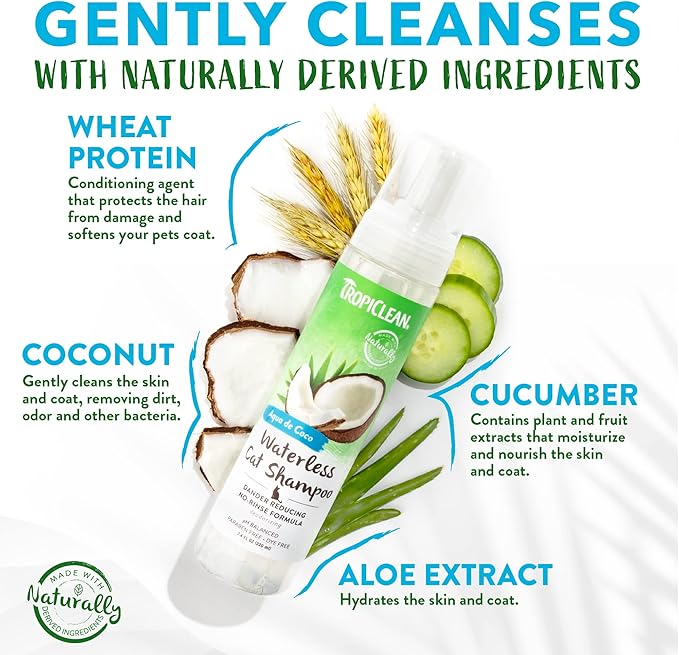 TropiClean No Rinse Waterless Cat Shampoo | Dandruff Treatment | Moisturizing Dry Shampoo for Dry Skin | USA Made | Aqua de Coco Scent | 7.4oz.