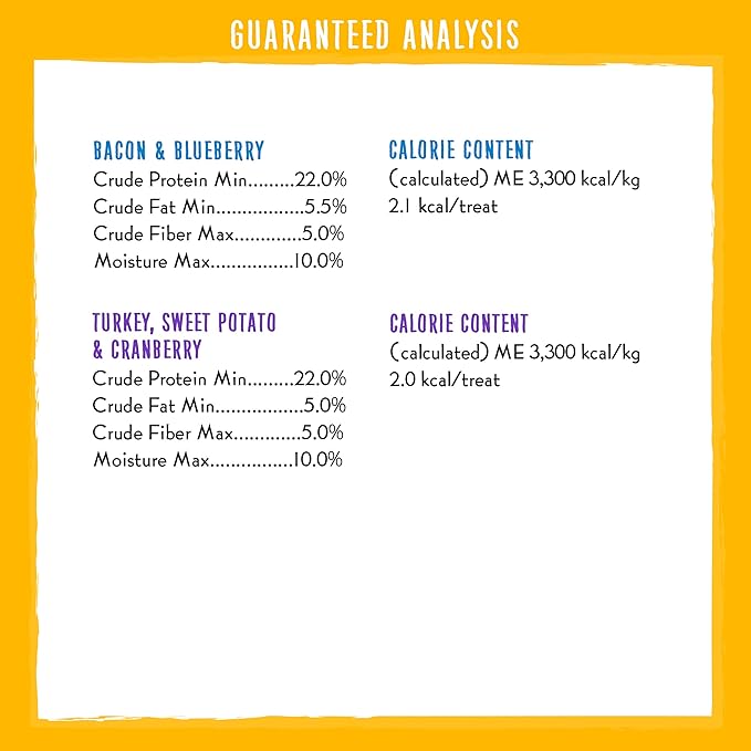 - All-Natural treats with the great taste of Bacon with the sweetness of blueberries taste that your dog will love PLUS Sweet Potato and Cranberry for a perfect variety.