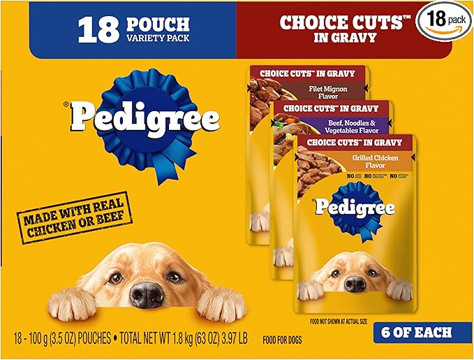 - VARIETY PACK CONTAINS EIGHTEEN (18) 3.5 oz. pouches of PEDIGREE CHOICE CUTS IN GRAVY Wet Dog Food: (6) Filet Mignon Flavor (6) Grilled Chicken Flavor (6) Beef, Noodles & Vegetable Flavor