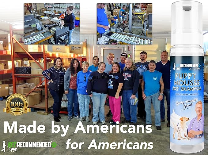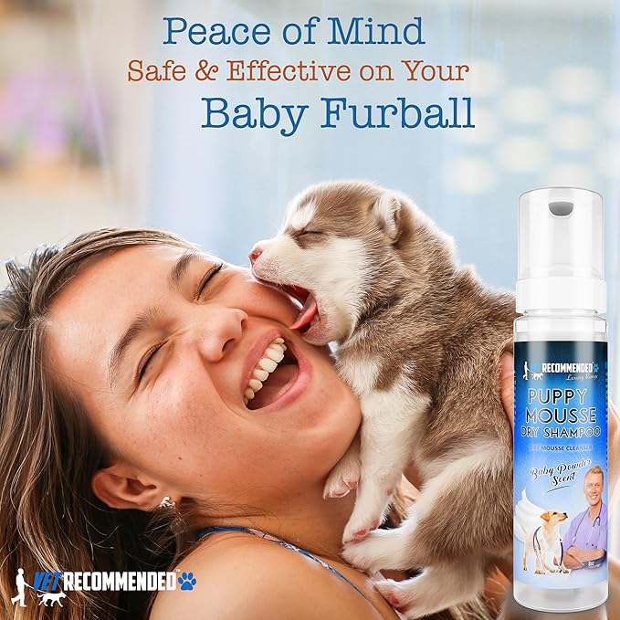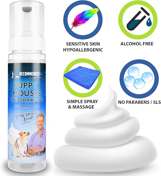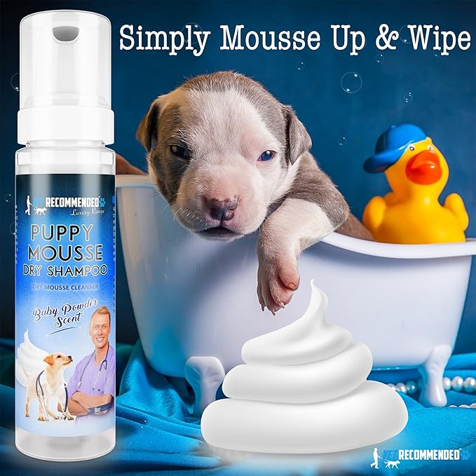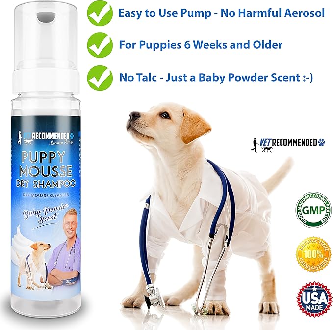 - Alcohol Free Solution: Vet Recommended Waterless Puppy Shampoo Mousse is a mild surfactant blend which is detergent free. Our puppy dry shampoo contains no alcohol or animal by-products. NO SLS or harsh detergents and is the safest option for your best friend. Safe for your puppy, but also minimal environmental impact on our planet. We do not promote testing on animals.