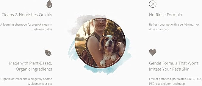 No Rinse Waterless Shampoo – Foaming Cleanser Pet Shampoo, Cruelty-Free and Nontoxic, Hypoallergenic Dog Shampoo Formula Made with Organic Oatmeal, Aloe, and Argan Oil (7.10oz)
