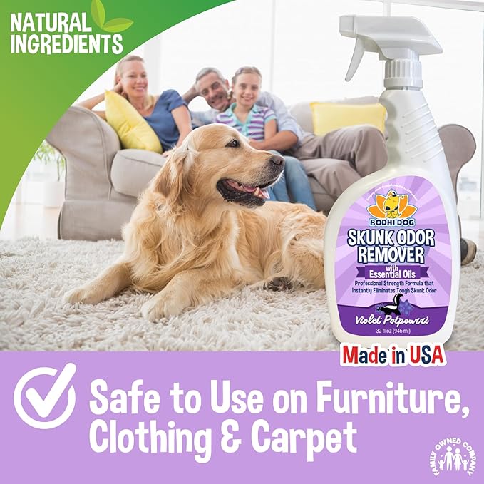 - Pleasant Fresh Violet Potpourri Scent: Our deskunk spray starts eliminating scent on contact leaving behind a delightful, pleasant fresh violet potpourri scent. The convenient spray bottle is a must have for a pet owner living in a neighborhood or near woods and wooded areas where you never know when animals will turn up and skunk your poor pet! Be ready this skunk season with our natural great smelling de-skunk spay.