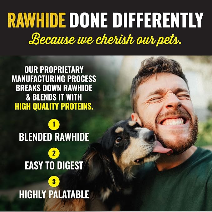 - Blended Rawhide – Our proprietary manufacturing process breaks down rawhide and blends it with protein.