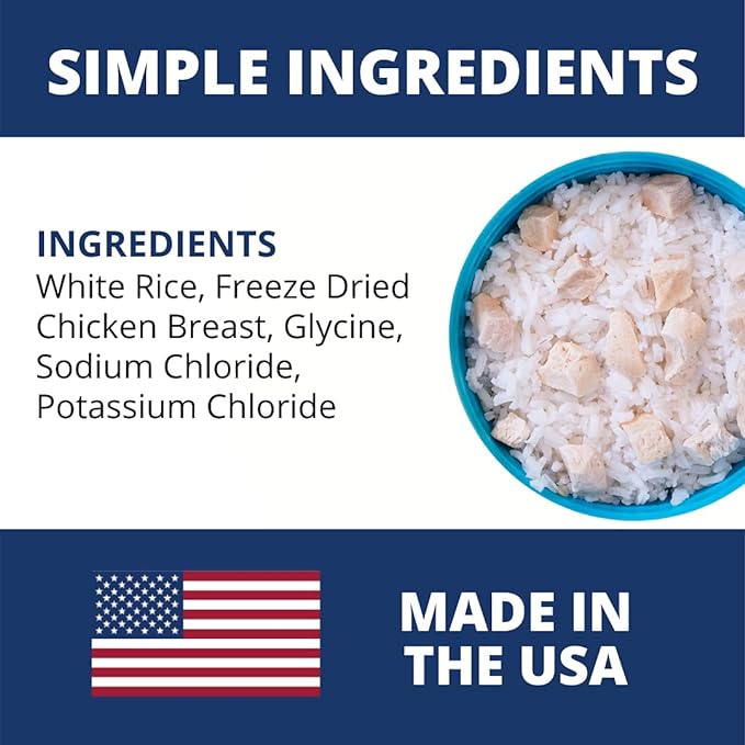 - OUR AWARD-WINNING BLAND DIET is freeze dried and contains white rice, and 100% human grade white meat chicken, raised cage free with NO antibiotics or hormones. Enhanced with a powerful electrolyte blend to boost hydration and energy.