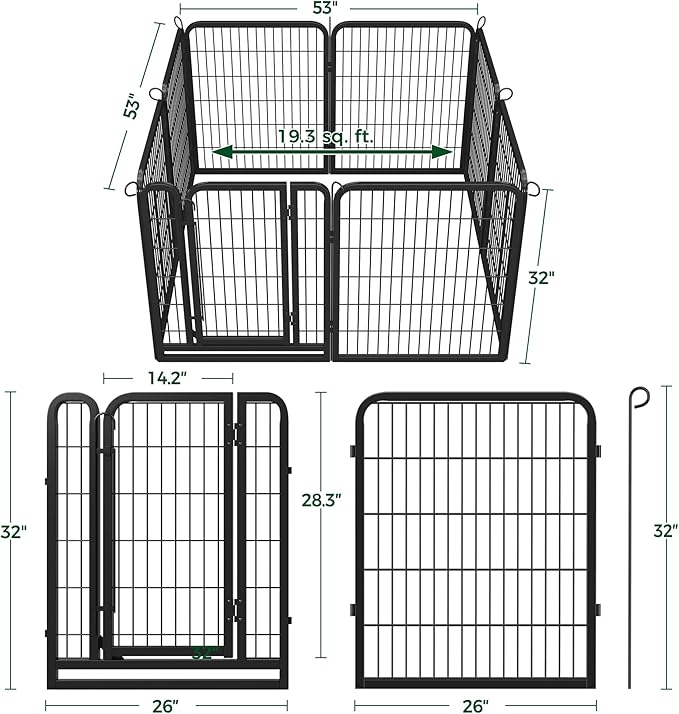 - Safety & Security: Ensuring the safety of your pets is of utmost importance to us. Our exercise pen is crafted with appropriate bar spacing and a latch that locks automatically as you close the door. Rounded edges also protect animals from injuries while preventing damage to wood or PVC floors. Additionally, stakes anchor the panels firmly to the grass or soft ground