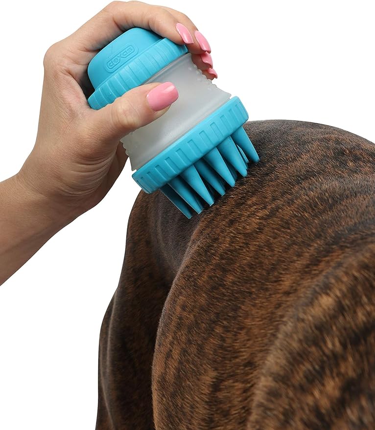 - ScrubBuster bathing brush holds pet shampoo inside, thick silicone bristles clean thoroughly, all the way down to the skin