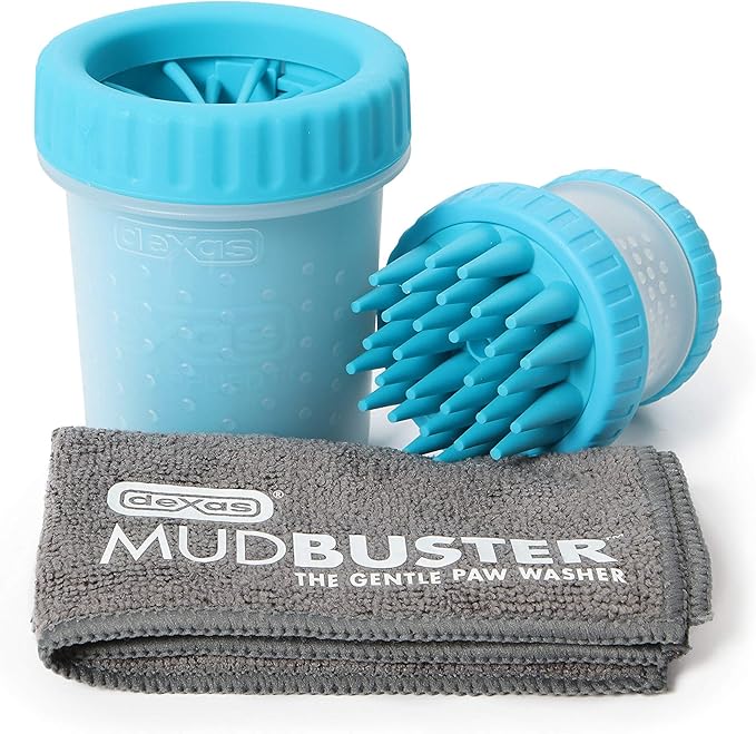 Dexas MudBuster Portable Pet Cleaning Kit with Dog Paw Washer, Pet Bathing Brush, Microfiber Towel, Small, Blue