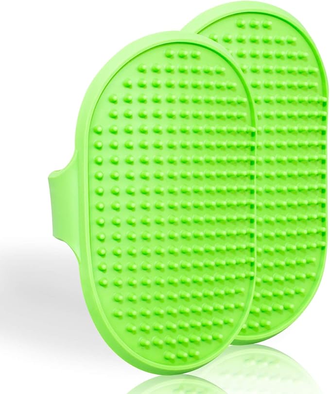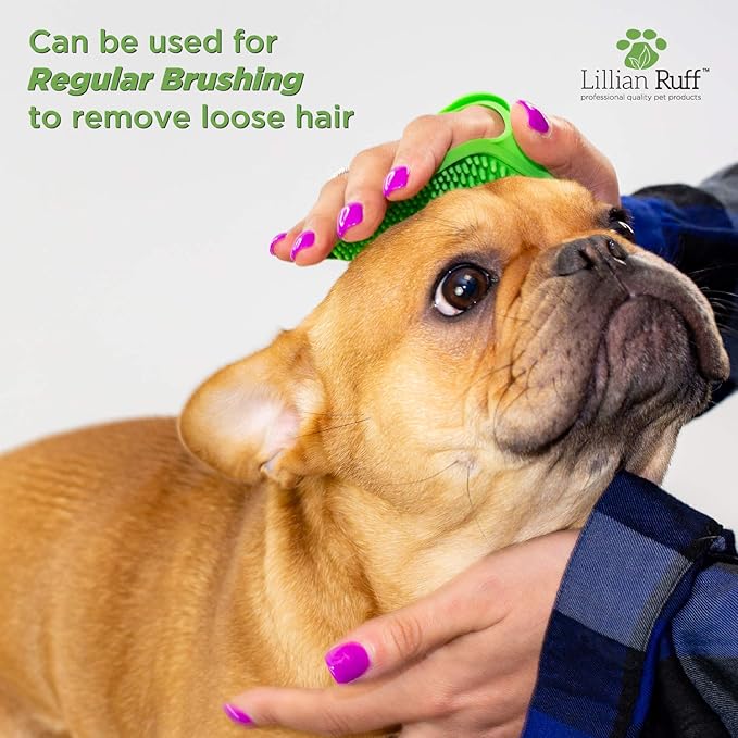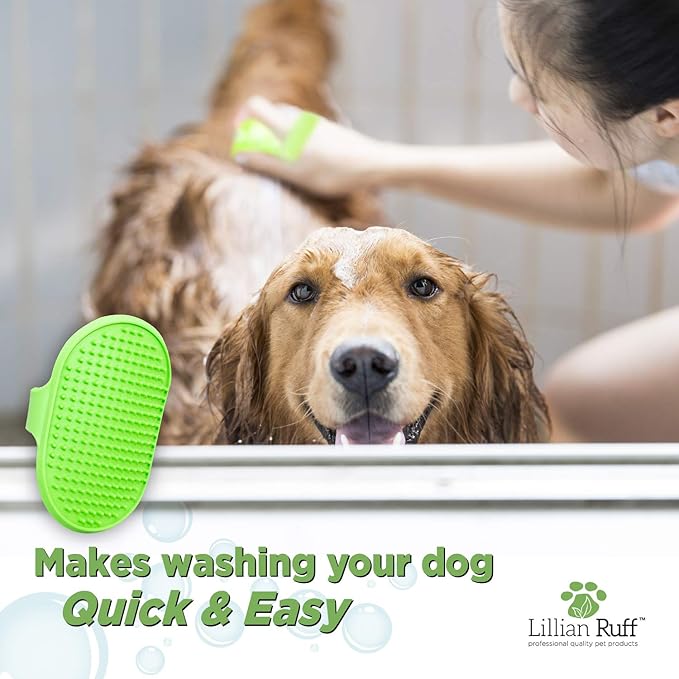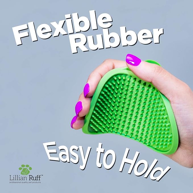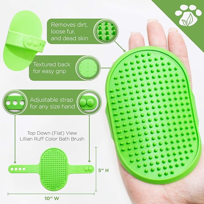 Lillian Ruff Dog Bath Brush - 2 Pack of Flexible Rubber Dog Shower Brush with Adjustable Strap - Soothing Massage Bristles Produce more Lather, Reduce Bath Time, Remove More Dirt & Loose Hair (Green)
