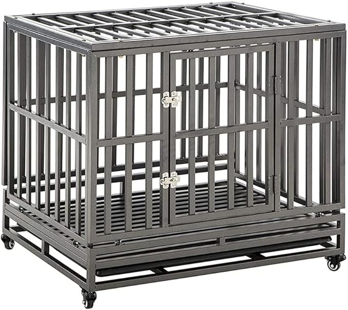 KELIXU 38” Heavy Duty Dog Crate Large Dog Cage Metal Dog Kennels and Crates for Large Dogs Indoor Outdoor with Locks, Lockable Wheels and Removable Tray, Easy to Install, Black