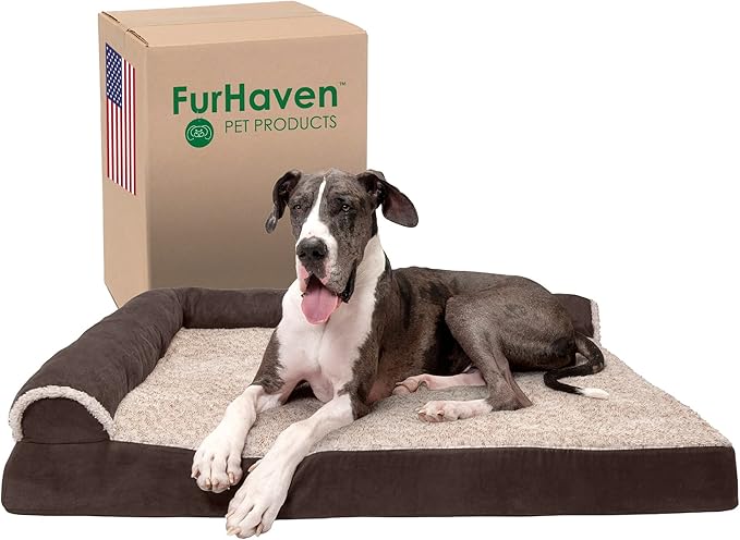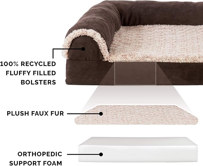 Furhaven Orthopedic Dog Bed for Large Dogs w/ Removable Bolsters & Washable Cover, For Dogs Up to 125 lbs - Two-Tone Plush Faux Fur & Suede L Shaped Chaise - Espresso, Jumbo Plus/XXL