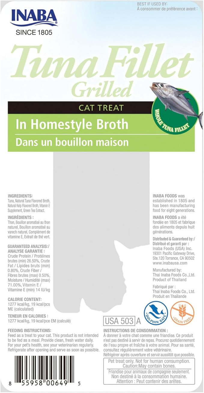 INABA Premium Hand-Cut Grilled Tuna Fillet Cat Treats/Topper with Vitamin E and Green Tea Extract, 0.52 Ounces Each, Pack of 6, Homestyle Broth