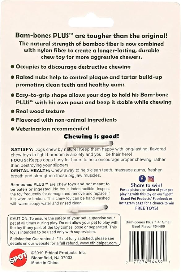 SPOT Bam-Bones Plus T Bone - Bamboo Fiber & Nylon, Durable Long Lasting Dog Chew for Aggressive Chewers – Great Toy for Adult Dogs & Teething Puppies Under 30lbs, Non-Splintering, 4in, Beef Flavor
