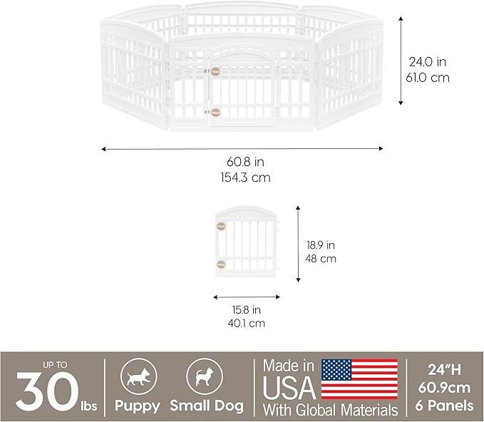 IRIS USA 24" 6-Panel Dog Playpen with Door, 61 x 61 x 24, Puppy Playpen, Dog Play Pen Indoors, Pet Fence, Small/Medium Pets, White