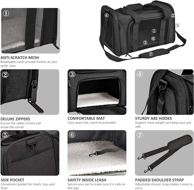 - DURABLE - This cat carrier is made of durable and lightweight polyester fabric. The four-side mesh will not only give a safe and comfortable travel for your pet, but also easy for you to check on your pet
