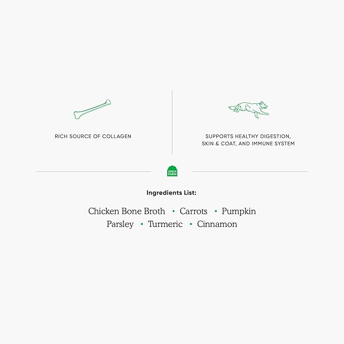 - SIMPLE HUMAN-GRADE INGREDIENTS: We wouldn’t serve our pets anything we wouldn’t serve ourselves that’s why Open Farm’s recipe features just 6 ingredients including carrots, pumpkin, parsley, turmeric, cinnamon, and of course, bone broth.