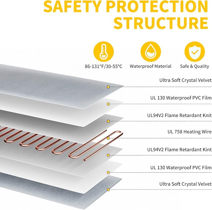 - ❤【Safety and Secure Structure】7-layer protective structure with UL-certified heating wire protect pets from burns. Soft PVC envelope with waterproof and flame-retardant function. Built-in intelligent temperature sensor in the heating pad to prevent overheating to protect pets. Don’t let your pets lay on the pet heating pad without a plush cover.
