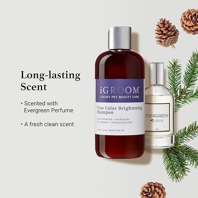 - COLOR ENHANCING DOG SHAMPOO – safe for all color coats. iGroom’s True Color Brightening Shampoo neutralizes unwanted tones in white coats and adds brilliance and depth of color to dark coats. Expect a glossy, radiant coat full of luster. With the fresh clean scent of iGroom Evergreen perfume.