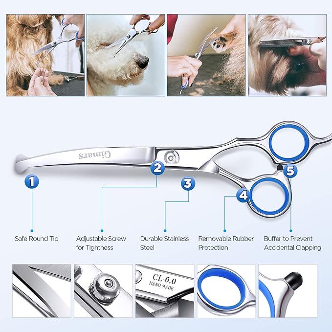 - 【Professional Dog & Cat Grooming Essential Tool for Groomers】Gimars dog grooming scissors are made of 4CR stainless steel, dipped in a ceramic coating and suffer 60 process carefully polishing and grinding, which makes blades will not rust, cleaned easily and keep the blades sharp for a longer time than stainless steel without this sheath