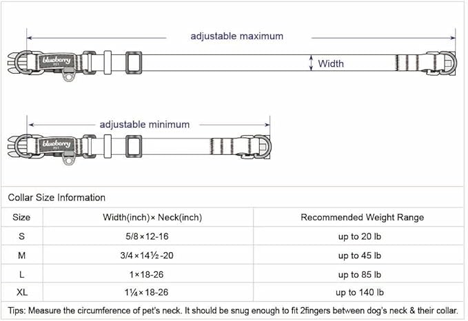 - Neck 18"-26", Width 1", Size Large; The dog collar reflective does not stretch itself, please make sure leave ONLY 2 fingers between collar and dog neck. A properly fitting nylon dog collar and harness won't leave any room for your dog to chew