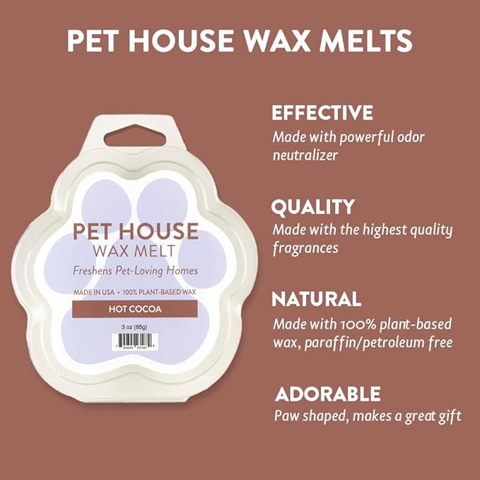 - Natural Wax for a Fresh Odor-Free Home: Fill your home with wonderful fragrances with our plant based scented wax melts. Pet House wax melts are specially formulated for pet loving homes. Our Hot Cocoa wax melt is a delectable blend of chocolate morsels, cocoa and vanilla with a hint of mint and whipped cream.